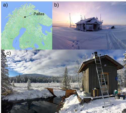 Figure 1. a) Location of the Pallas Research catchment in N Finland, b) FMI Atmospheric mountain-top air chemistry lab at Sammaltunturi, where continuous water vapor isotope measurements for moisture source tracing are collected and c) the stream monitoring hut for continuous water isotope, DOC, temperature, and nutrient trait measurements.