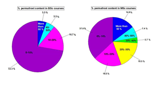The paper is the first Nordic permafrost curriculum mapping which covered 11 universities, representing all the Nordic countries. The paper showed that permafrost is taught within bio- and geosciences and engineering disciplines, however, only five dedicated courses on permafrost science and engineering are currently available in the region. In addition, 23 bachelor’s and 25 master’s courses include permafrost content ranging from 1% to 50%. At this time, there is no specific course offered at a PhD level on permafrost in Nordic countries. The curriculum mapping is the first roadmap that overviews all permafrost educational activities in Nordic countries.
