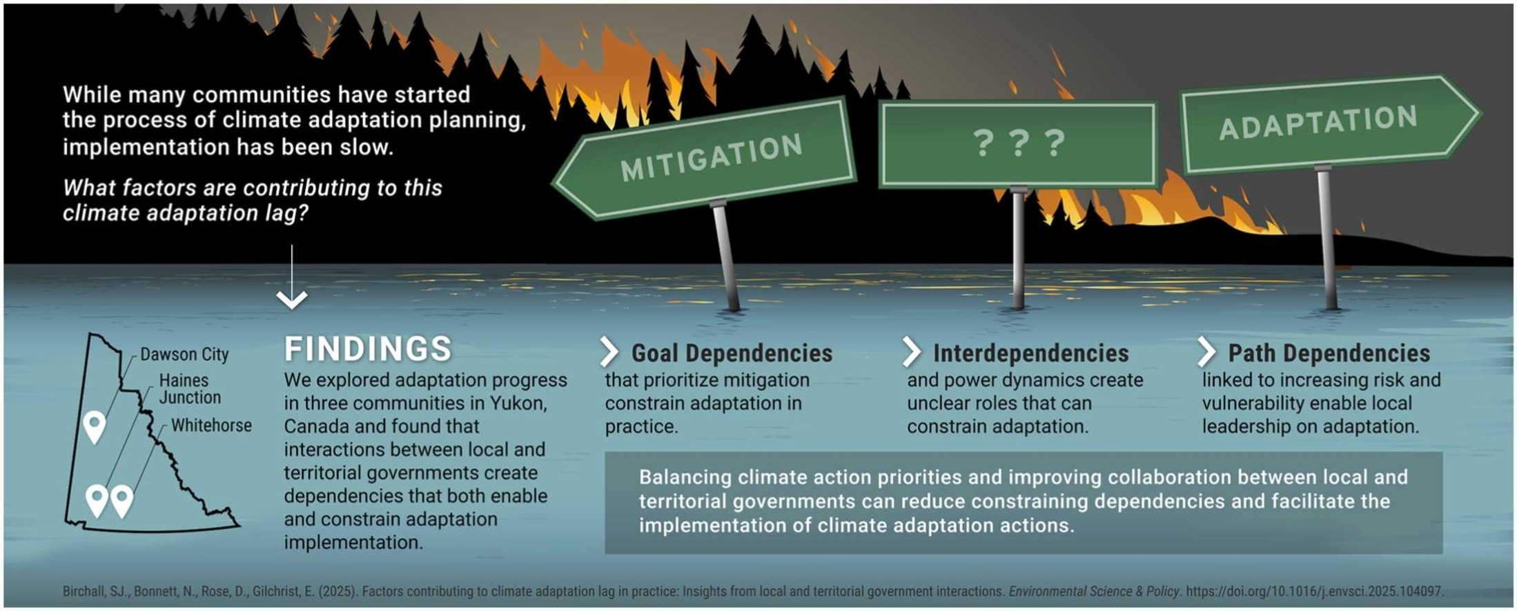 Thus their study focuses on three communities in Yukon, Canada, a northern territory where wildfire, flood and permafrost thaw are an on-going challenge for local decision makers. They showcase how strong dependencies and power dynamics between actors and institutions across local and the territorial government have led to weakened local innovation, delayed support, and unclear government roles, all of which have stymied momentum on climate adaptation in practice. The authors suggest ways these communities, and others around the globe, can overcome persistent barriers that constrain adaptation implementation, including how to harness climate adaptation enablers to facilitate the process.