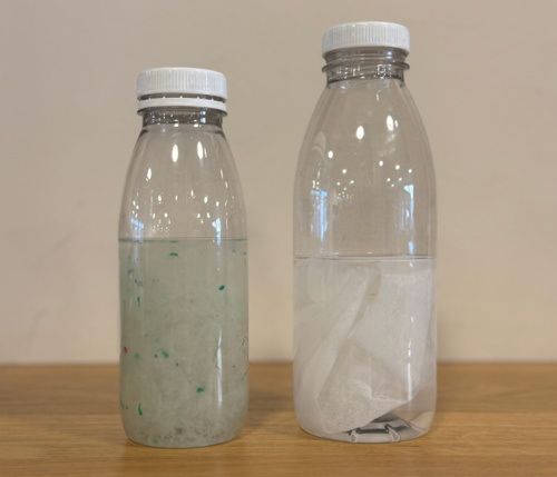 Toilet paper in a thousand pieces to the left, and the wet wipe still intact, to the right. Photo: Pernille Erland Jensen.